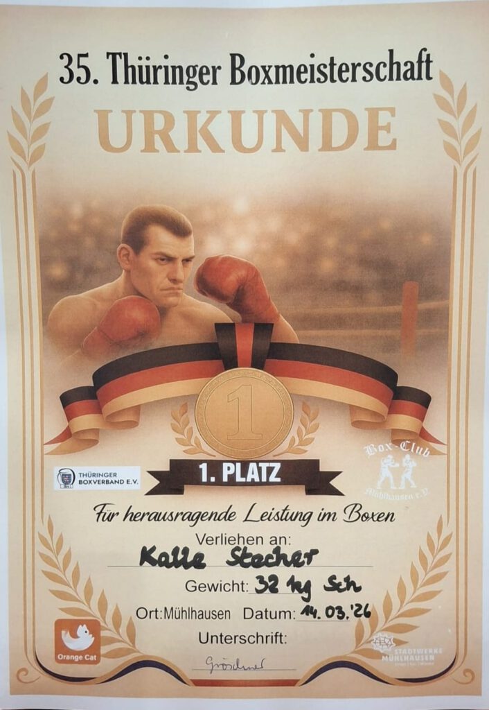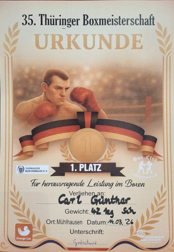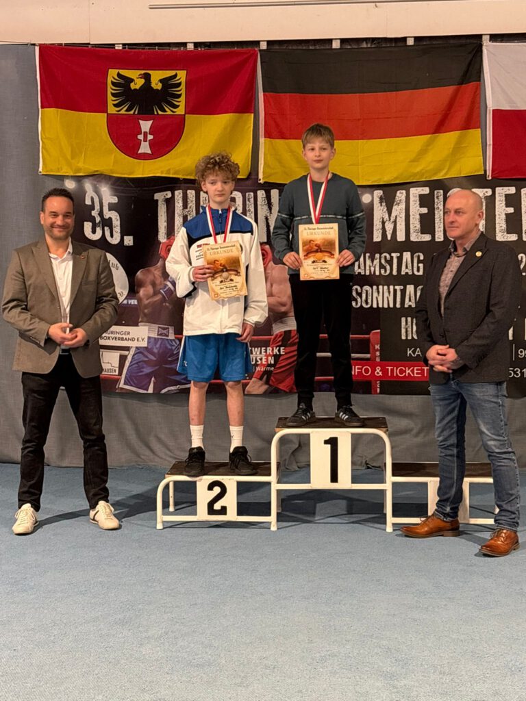 Zwei vielversprechende Boxtalente (Carl Günther und Kalle Stecher) vom SVW zeigten am vergangenen Wochenende bei den 35. Thüringer Boxmeisterschaften ihr Können und belohnten sich mit starken Leistungen am Ende mit jeweils dem 1. Platz in Ihrer Alters-/Gewichtsklasse. Carl und Kalle überzeugten mit großem Einsatz, technischem Können und Kampfgeist im Ring. Die sehr guten Platzierungen zeigen, dass sich das harte Training auszahlt und wir hoffen in Zukunft noch viel von den beiden Talenten zu sehen. Wir freuen uns sehr, solche Talente im Verein zu haben und danken natürlich auch den beiden mitgereisten Trainern Oliver Stichling und Tony Hastolz.